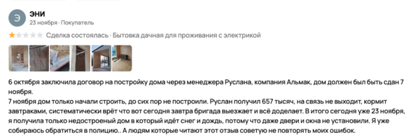 Формально компания позиционирует себя как производителя бытовок и каркасных домов. По факту же складывается впечатление, что основной производимый продукт — это пустые обещания, затягивание сроков и обман клиентов. Клиенты Альмак, судя по отзывам и обращениям, сталкиваются с одной и той же моделью поведения: на словах всё красиво, на деле — бесконечные переносы, вранье, отговорки и отсутствие элементарного профессионализма.