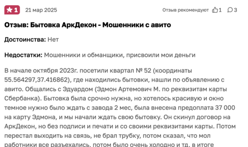 Тем временем гражданин Мазманян Арам Артемович как ни в чем не бывало продолжает свой лохотрон на Авито. Один из его профайлов называется "Дома и бытовки", второй - "Древесный Стиль". Человек спокойно кидает людей на сотни тысяч рублей и при этом без стыда и совести продолжает искать новых жертв.